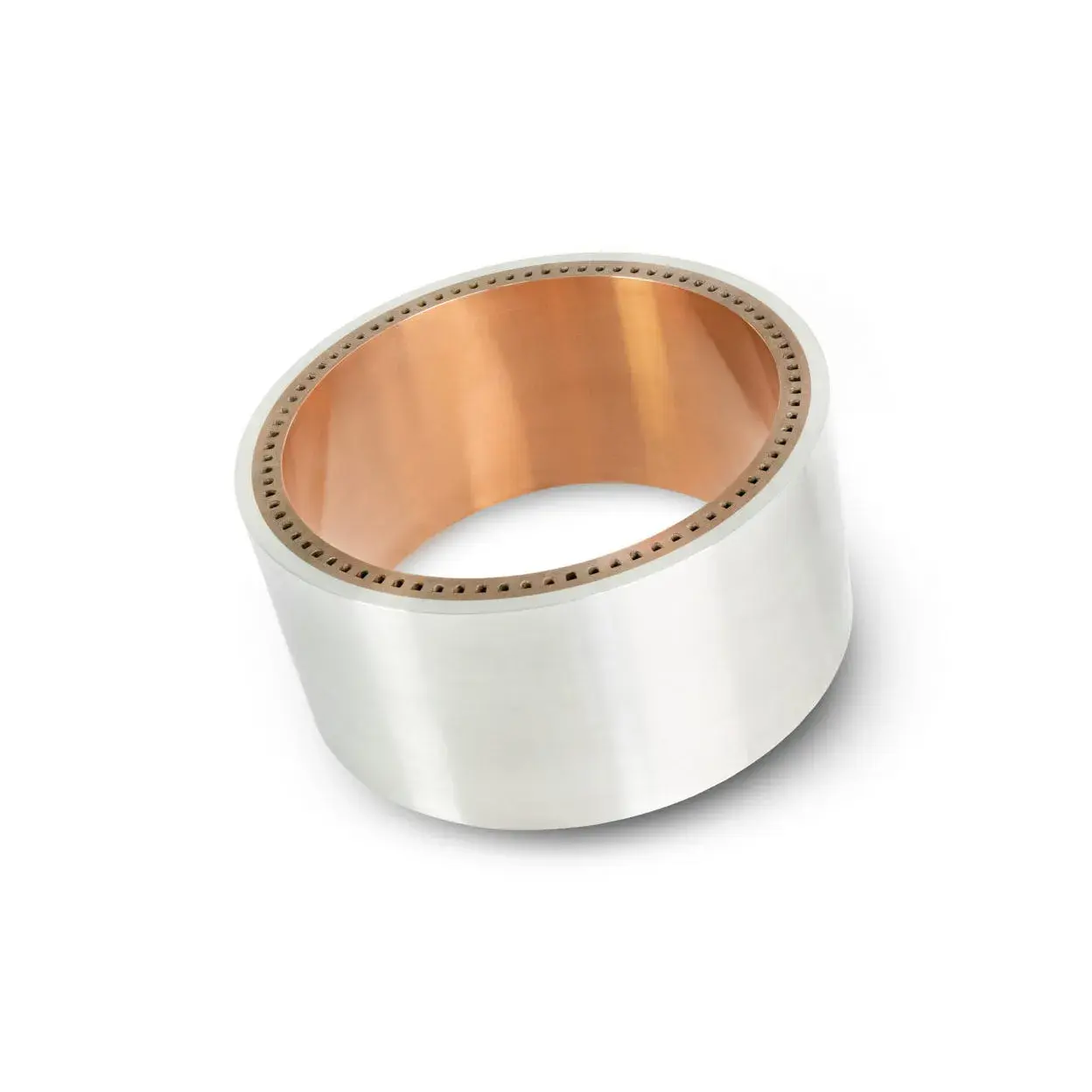 次に、充填された溝の上にコールドスプ レー堆積プロセスが進行し、冷却チャネ ルを覆い、意図した燃焼室設計に必要な 厚さを実現します。チャネルを密閉する ために、同一または異なる銅合金が使用されます。